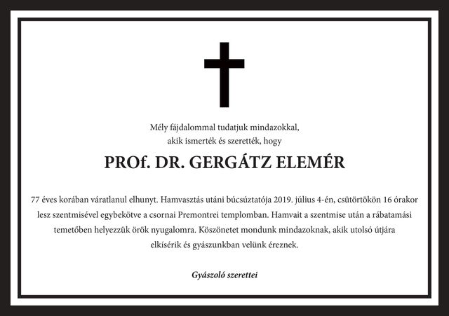 Szomorú szívvel tudatjuk, hogy Alma Materünk c. egyetemi tanára és hajdani tanszékvezető egyetemi docense, Magyarország első állatbiotechnológiai kutatóintézetének, a magyaróvári Biotechnikai Állomásnak alapítója és vezetője, hazánk egykori földművelésügyi minisztere, Dr. Gergátz Elemér tanár úr 2019. június 19-én este, életének 78. évében elhunyt.