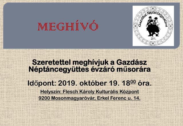 Az éves hagyományos Néptánc-gálát 2019. október 19-én (szombat) 18 órai kezdettel rendezi a Gazdász Néptáncegyesület!