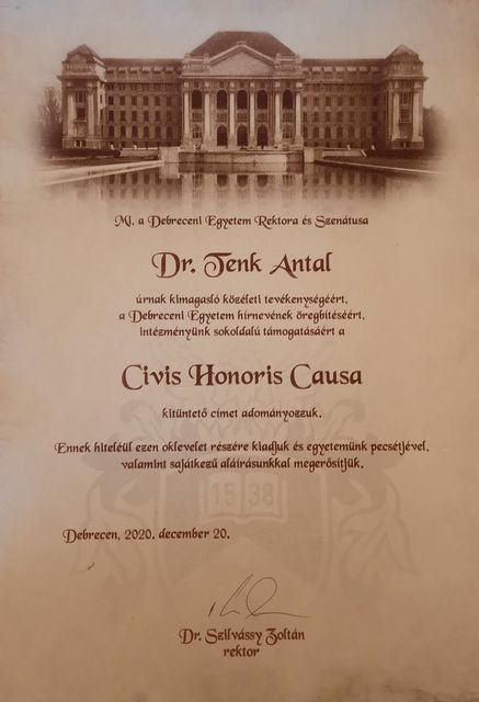 A Debreceni Egyetem Rektora és Szenátusa Tenk Antal kimagasló közéleti tevékenységét, a Debreceni Egyetem hírnevének öregbítését és az intézmény sokoldalú támogatását Civis Honoris Causa kitüntető cím adományozásával ismerte el.