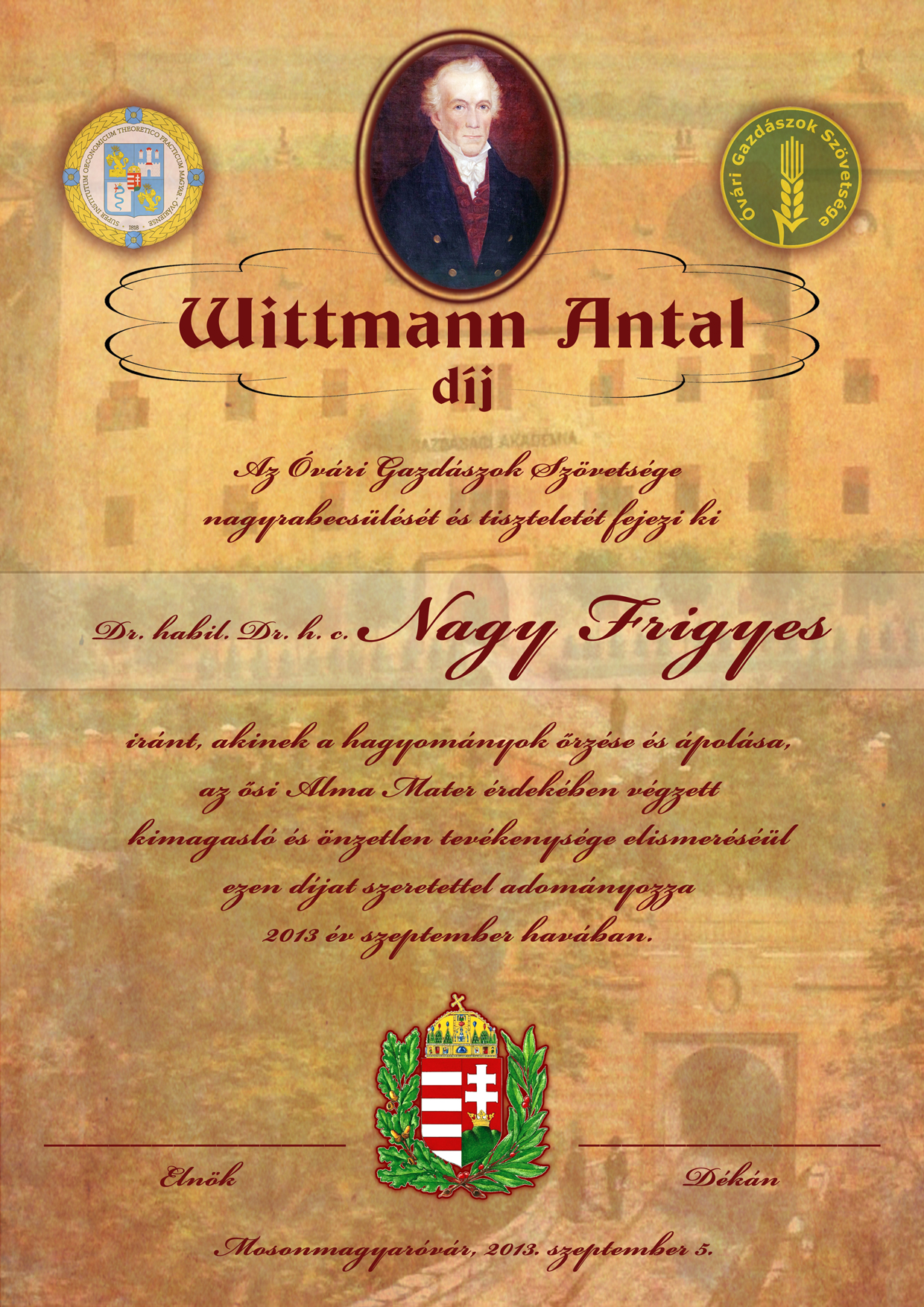 Dr. Nagy Frigyes Wittmann-díjához készült emléklap