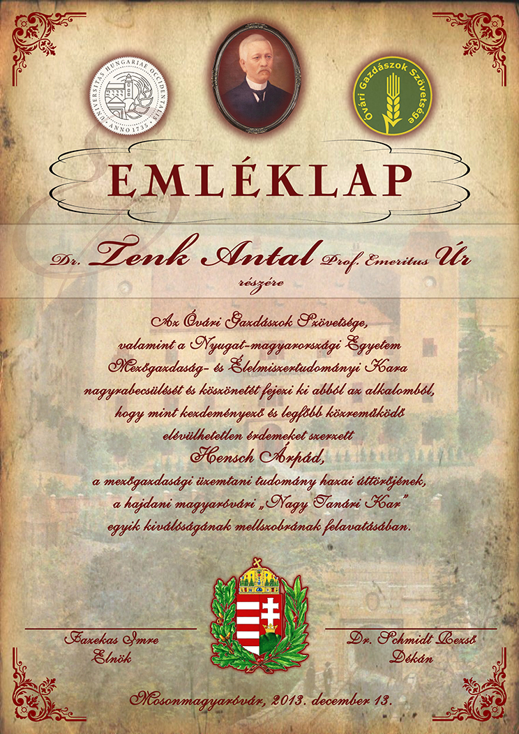 Emléklap Dr. Tenk Antal számára a Hensch-szobor felavatása alkalmából