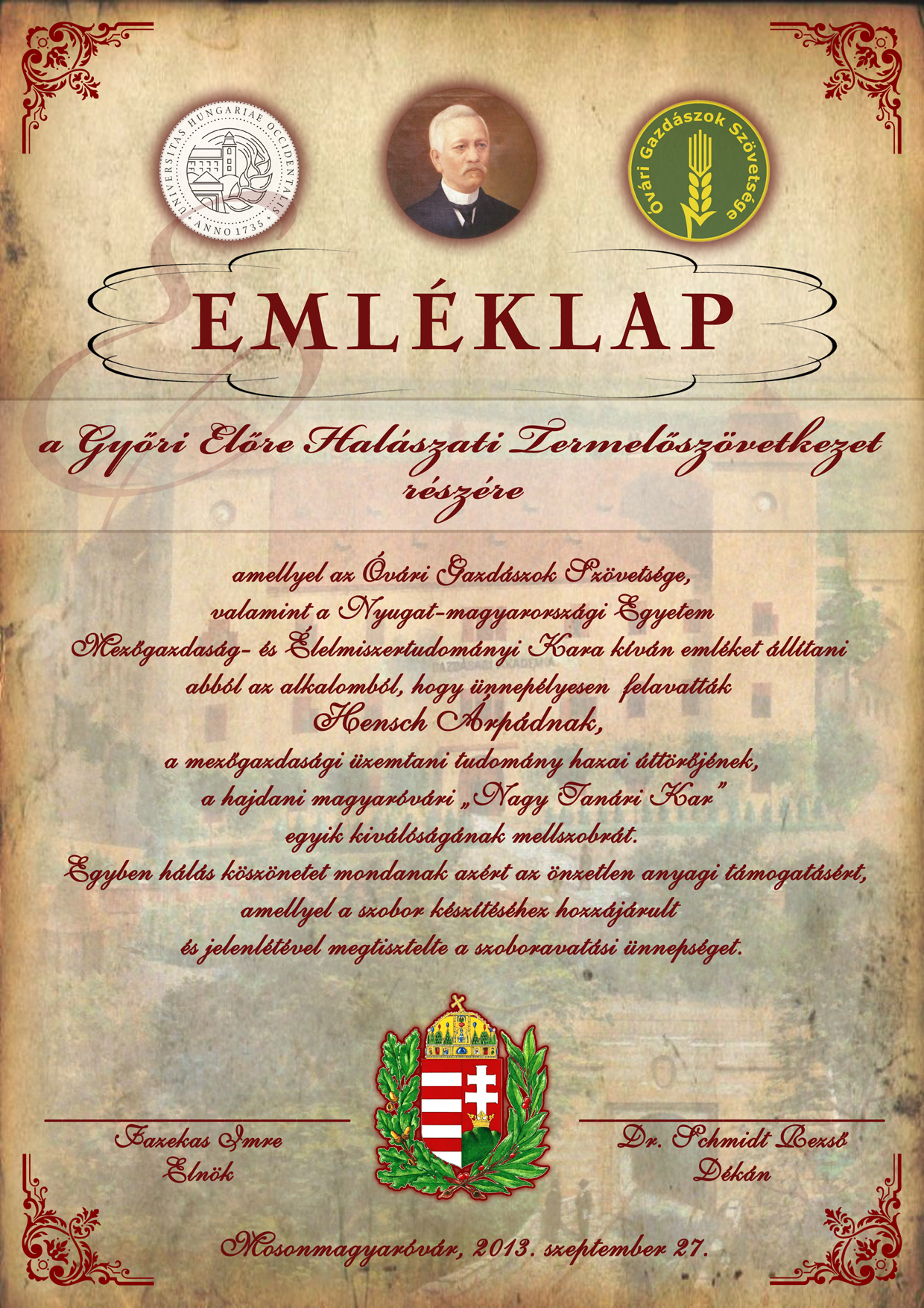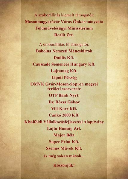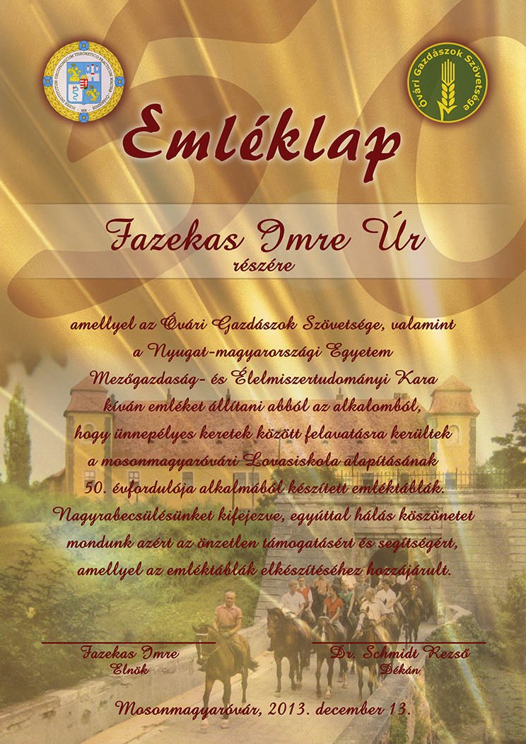 Támogatói emléklap Fazekas Imre részére a mosonmagyaróvári Lovasiskola alapításának 50. évfordulója alkalmából készített emléktáblák felavatása alkalmából