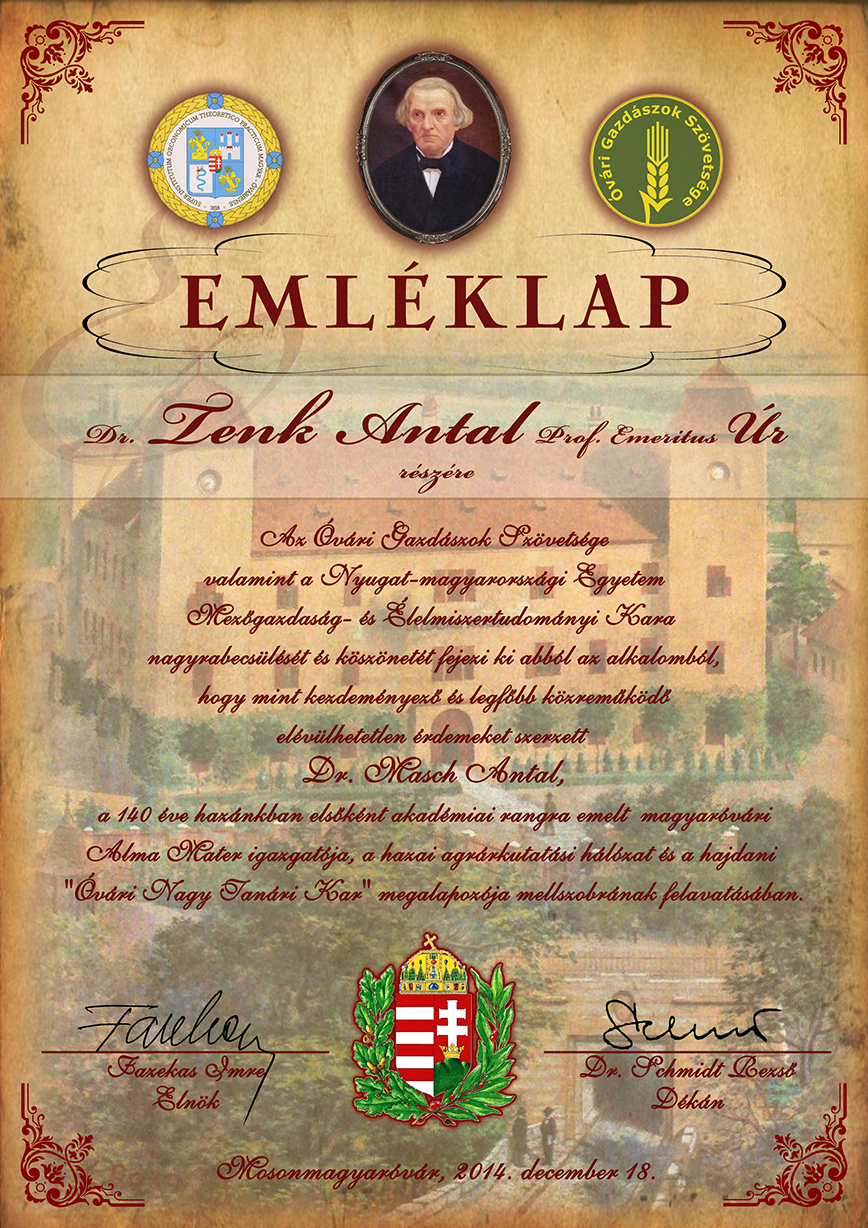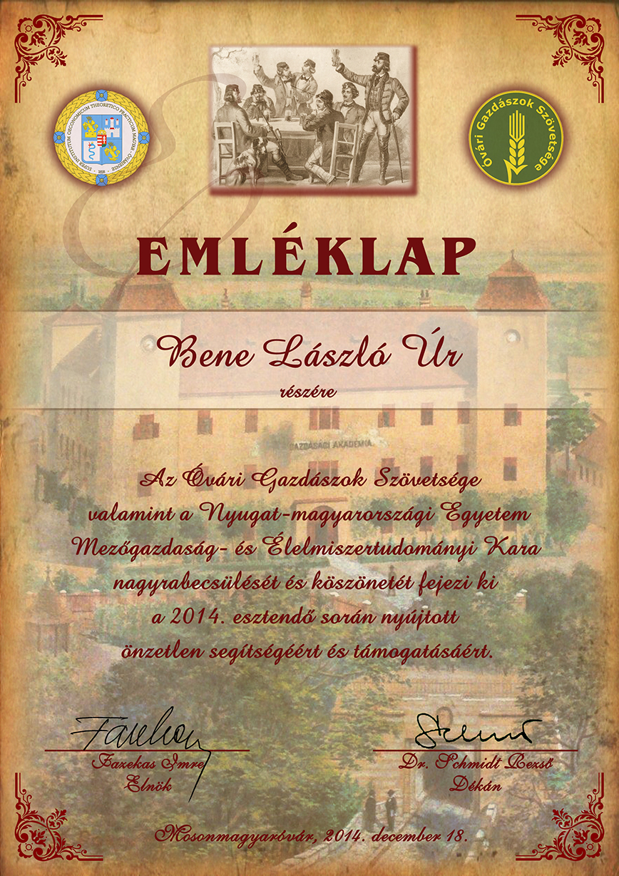 Emléklap Füssy Aladár gránit diplomás óvári gazdász számára 98. születésnapja alkalmából