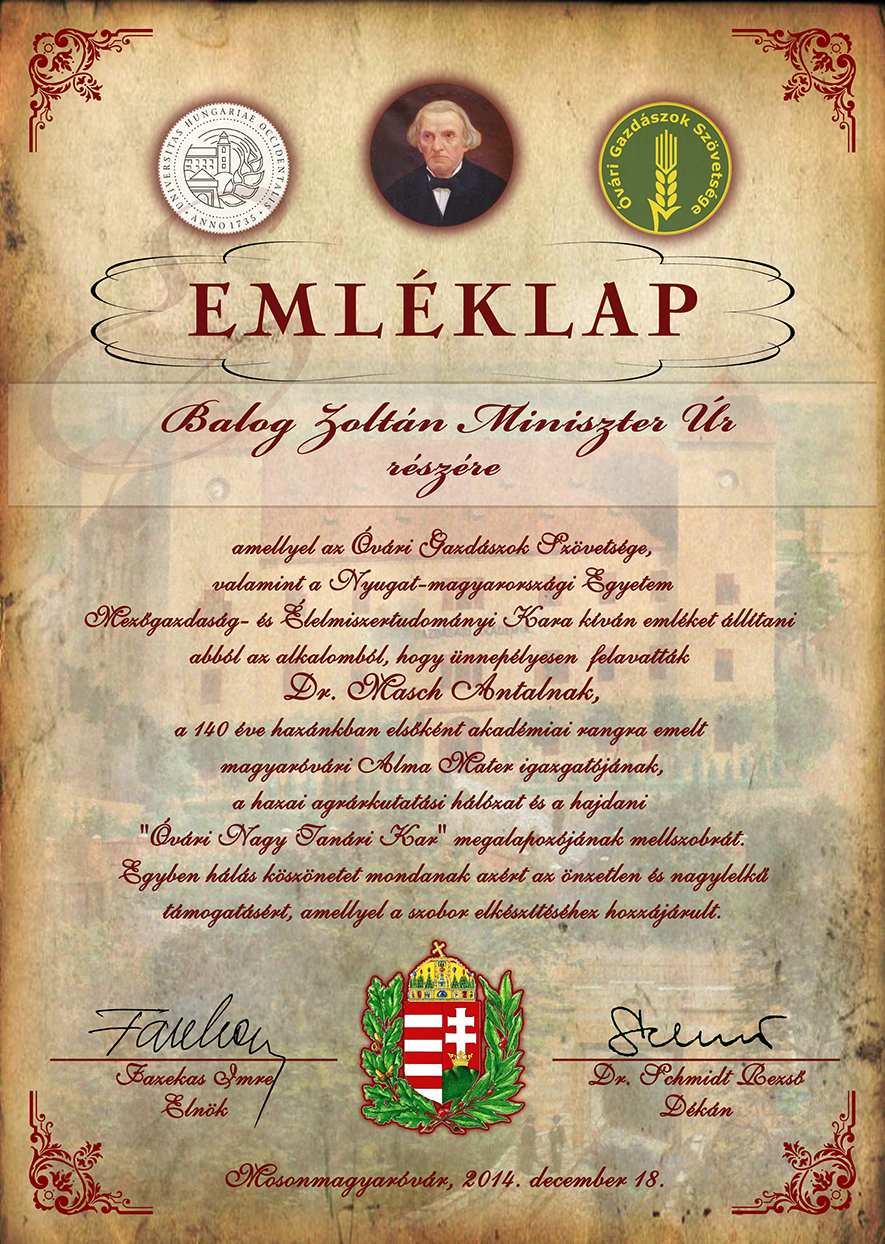 Balog Zoltán miniszter úr részére készült támogatói emléklap a Masch-szobor felavatása alkalmából