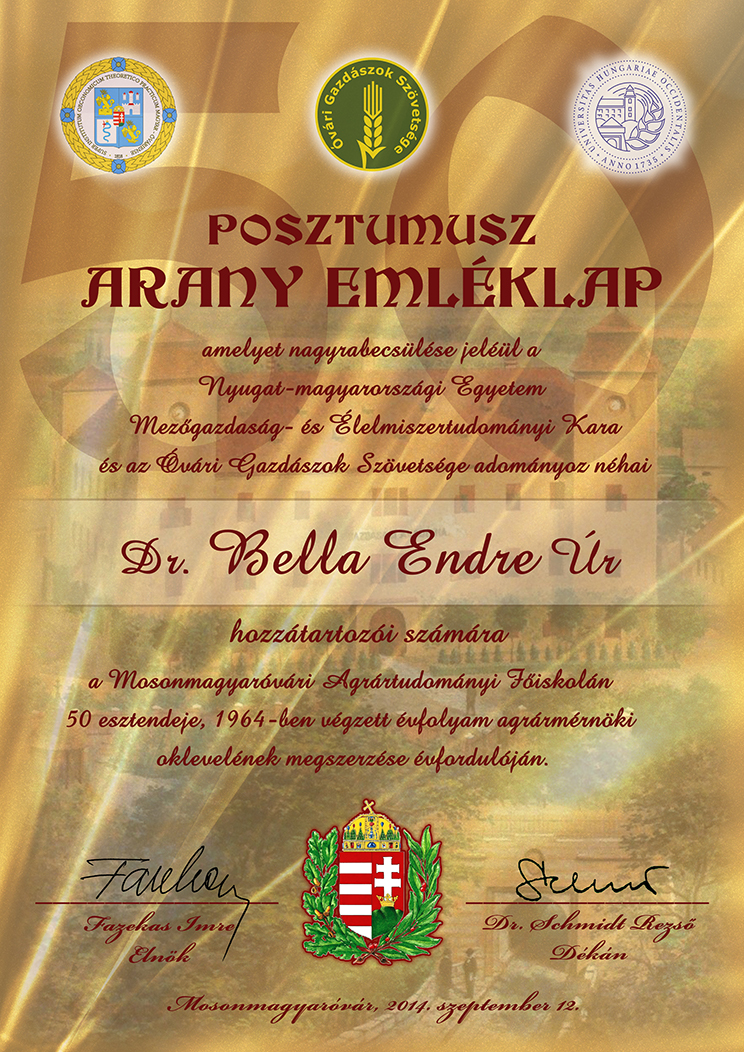 Dr. Bella Endre hozzátartozó részére készült posztumusz arany emléklap az 1964-ben végzett évfolyam díszoklevél átadó ünnepsége alkalmából