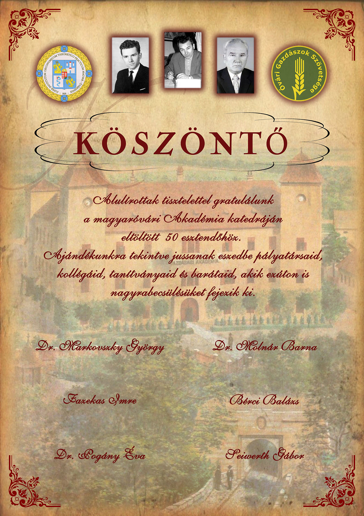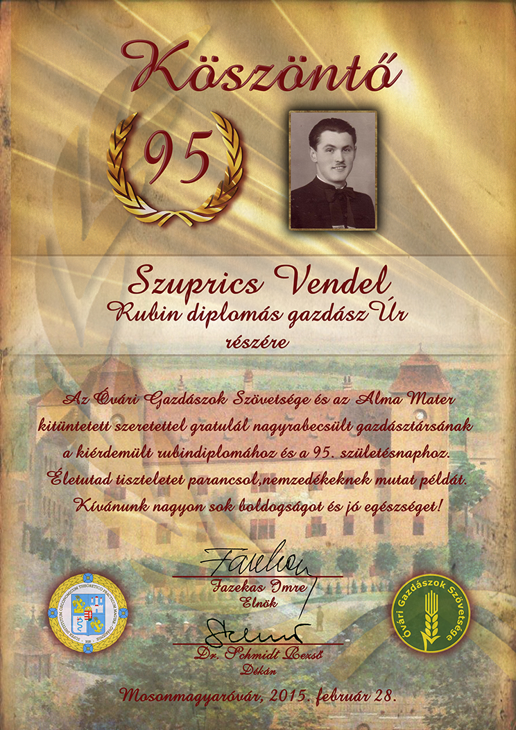 Köszöntő emléklap Szuprics Vendel rubin diplomás óvári gazdász számára 95. születésnapja alkalmából