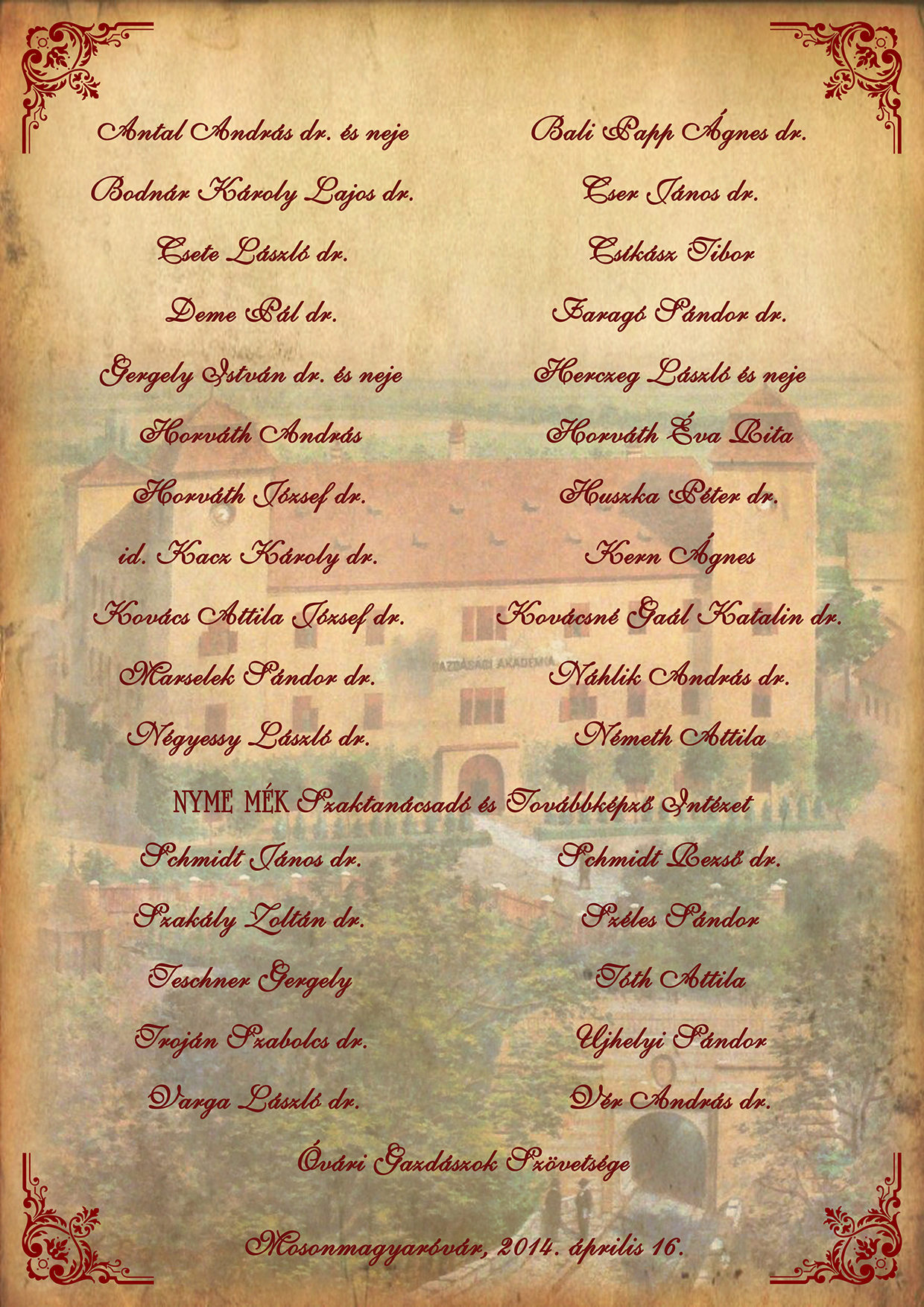 Császár Sándor énekes, óvári gazdász számára az Adventi Hangverseny alkalmából készült emléklap