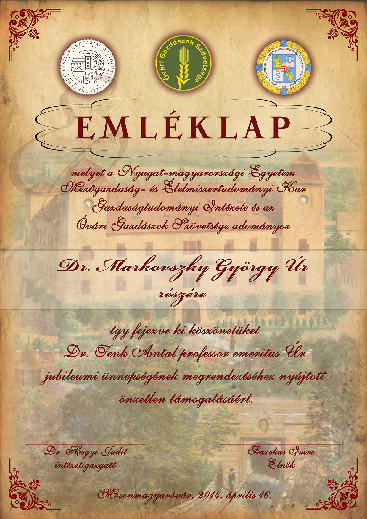 Dr. Markovszky György részére készült támogatói emléklap
