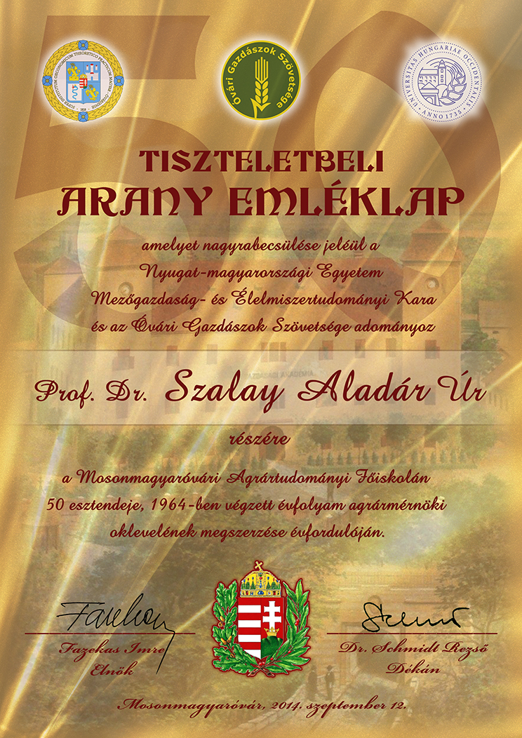 Prof. Dr. Szalay Aladár részére készült tiszteletbeli arany emléklap az 1964-ben végzett évfolyam díszoklevél átadó ünnepsége alkalmából