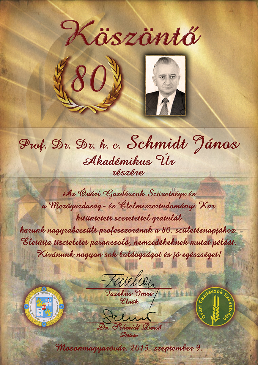Köszöntő emléklap Dr. Schmidt János akadémikus számára 80. születésnapja alkalmából