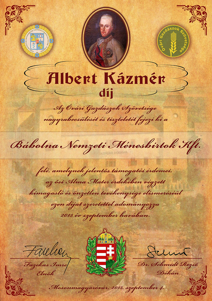 A Bábolna Nemzeti Ménesbirtok Kft. Alber Kázmér-díjához készült emléklap