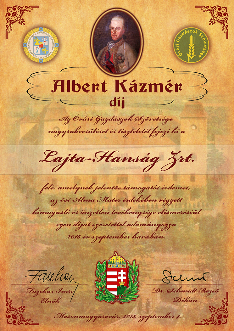 A Lajta-Hanság Zrt. Alber Kázmér-díjához készült emléklap