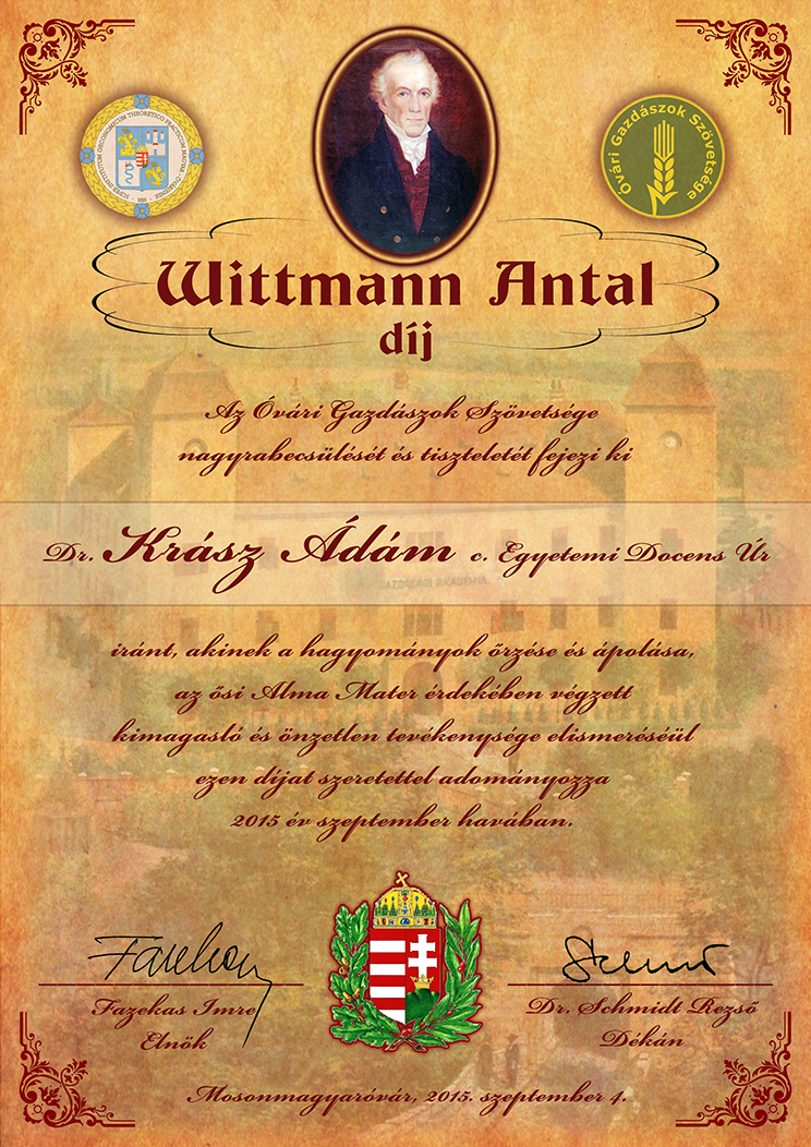 Dr. Krász Ádám Wittmann-díjához készült emléklap