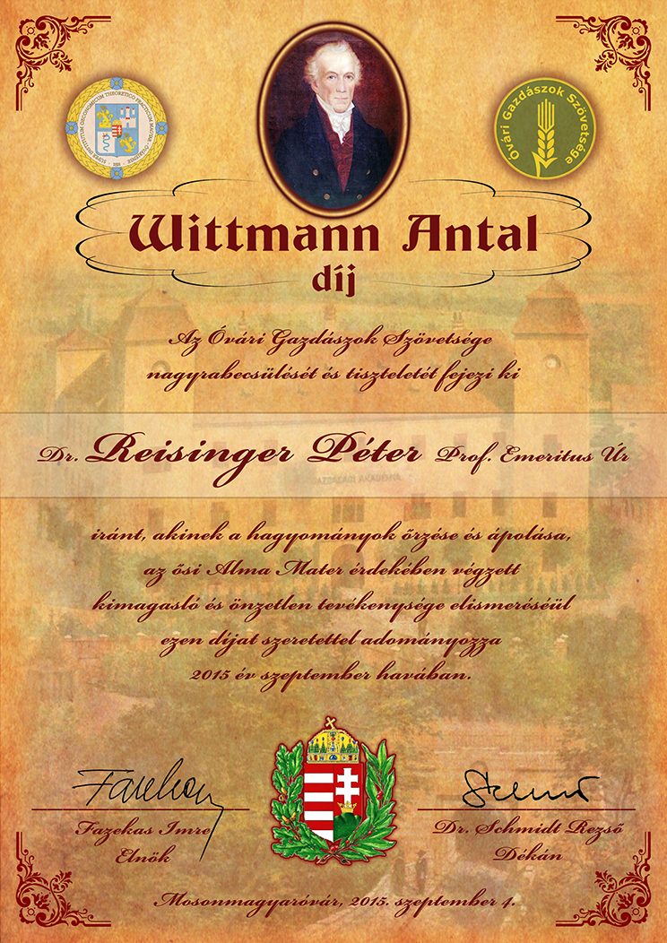 Dr. Reisinger Péter Wittmann-díjához készült emléklap