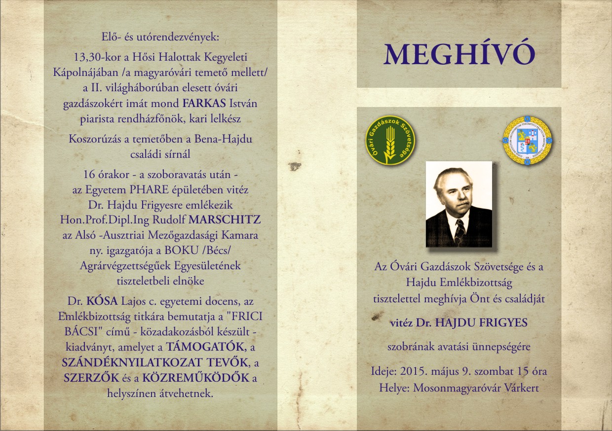 A vitéz Dr. Hajdu Frigyes szobor avatására készült meghívó (hátlap és fedlap)