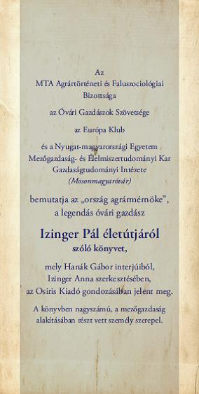 Az Izinger Pál életútja c. kötet bemutatójára készült meghívó (1. oldal)