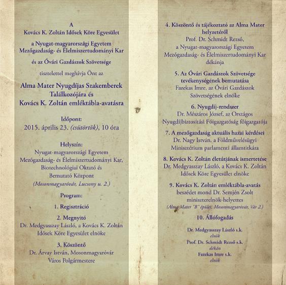 Alma Mater Nyugdíjas Szakemberek Találkozójára és a Kovács K. Zoltán emléktábla-avatásra készült meghívó (2-3. oldal)