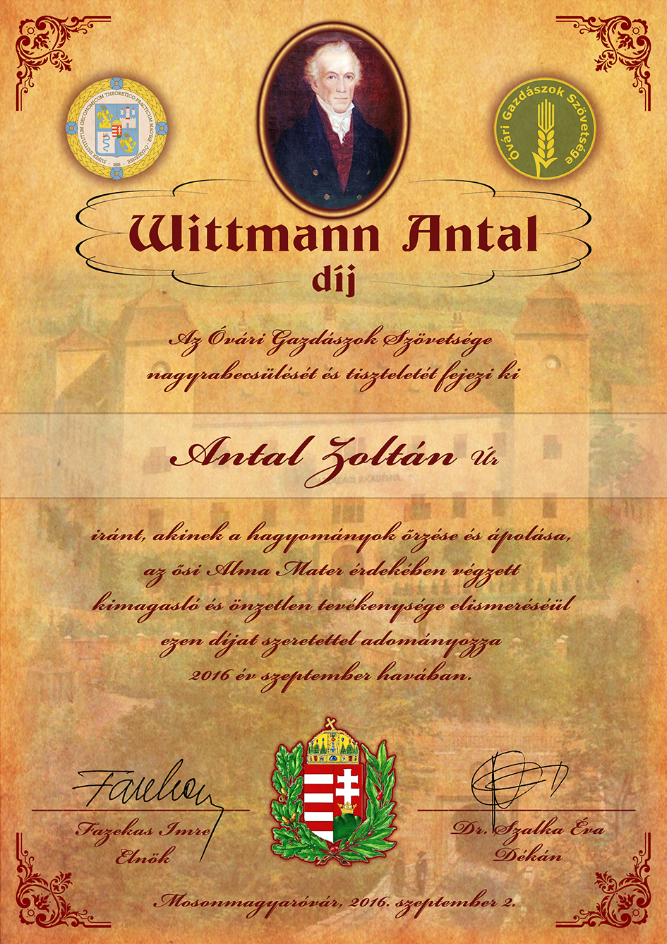 Antal Zoltán Wittmann-díjához készült emléklap