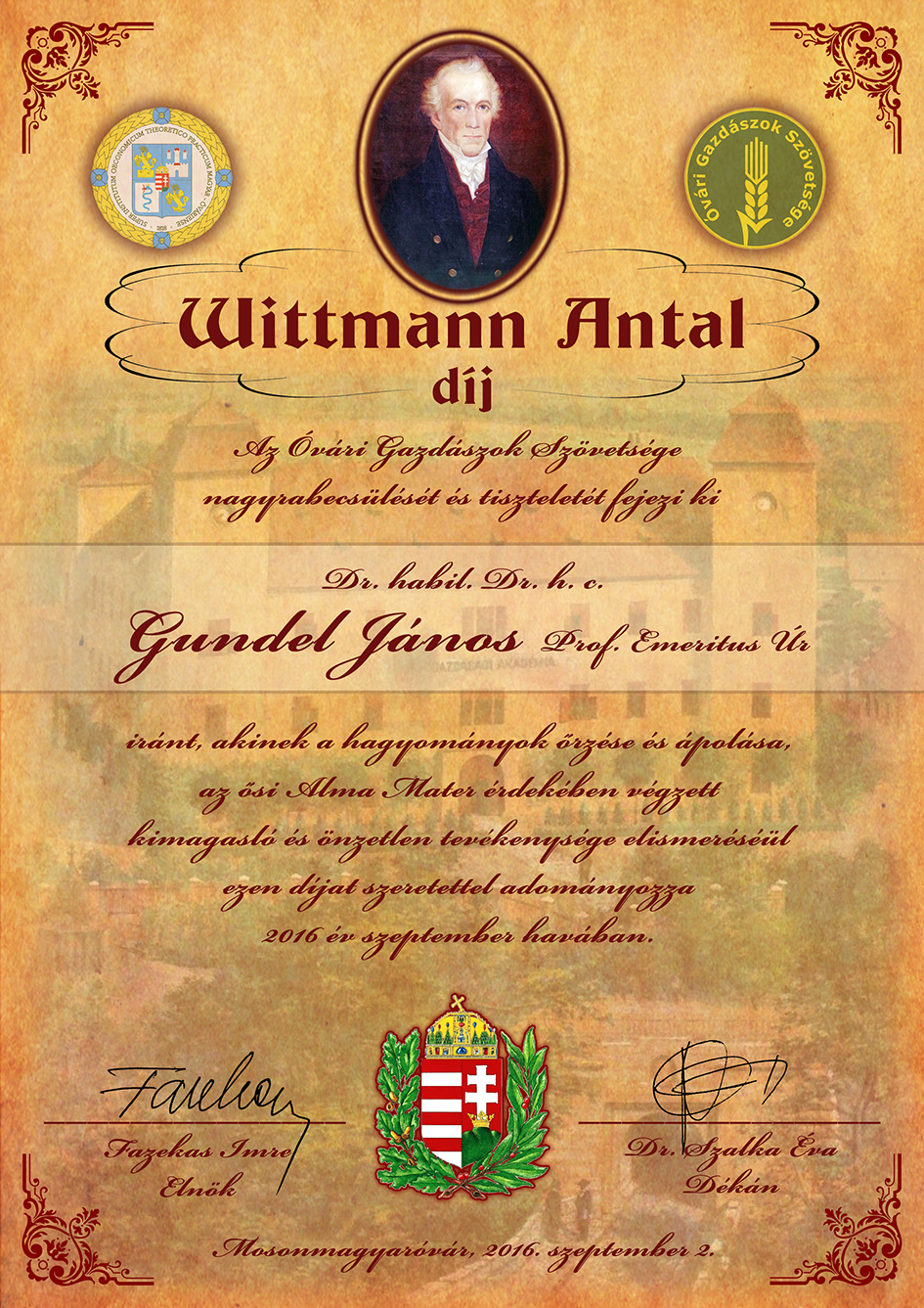 Dr. Gundel János Wittmann- díjához készült emléklap