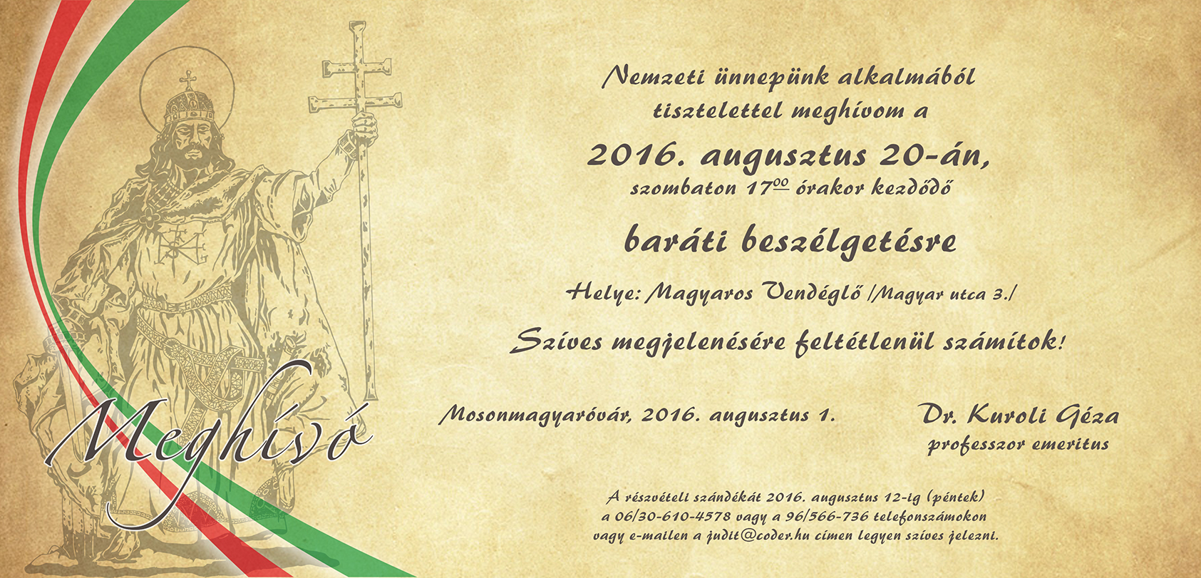 Dr. Kuroli Géza Pro Urbe Díjának átadójára készült meghívó