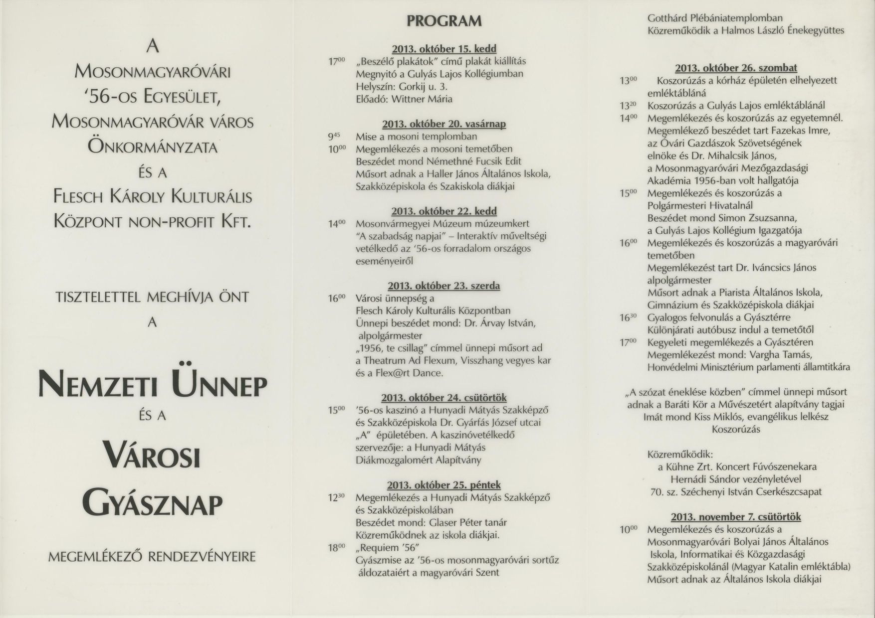 A megemlékező rendezvényen beszédet mond Fazekas Imre, az Óvári Gazdászok Szövetségének elnöke, valamint Dr. Mihalcsik János, a Mosonmagyaróvári Mezőgazdasági Akadémia 1956-ban volt hallgatója.